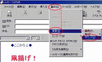 (注意) ダウンロードファイルには、サウンドは ありませんので下記から入手してくだ さい。 メッセージ作成画面のメニューバー より「書式」→「背景」→「サウンド」 をクリックします |