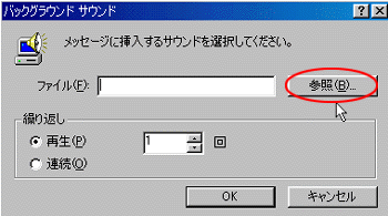 「参照」をクリック 好きなサウンドをダウンロードし ダウンロードしたファイルをデスク トップなどにおいて指定します 「なびなび」Active Mail Service でのサウンドは、 [MIDI素材ピアノソロ倶楽部]様の 許可をいただいて使用しています <使用の際は、必ず許可をとって ください> |