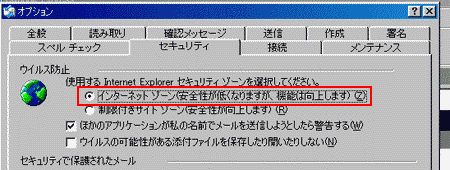 クリックして下さい。アウトルック6.0では、セキュリティを強化しているため、初期設定では、「ウィルス防止」の